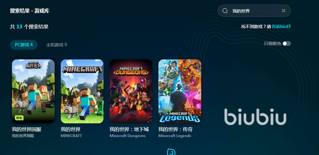 玩我的世界当然要用biubiu加速器了,它可以免费试用,只要大家注册新用户就自动获得24小时试用时间,新用户还享受最低10元充会员的优惠。大家安装好biubiu以后在站内搜索我的世界,就能看到里面包括有电脑国服、国际服和主机游戏等多个加速资源,想玩的时候随时都能开启。