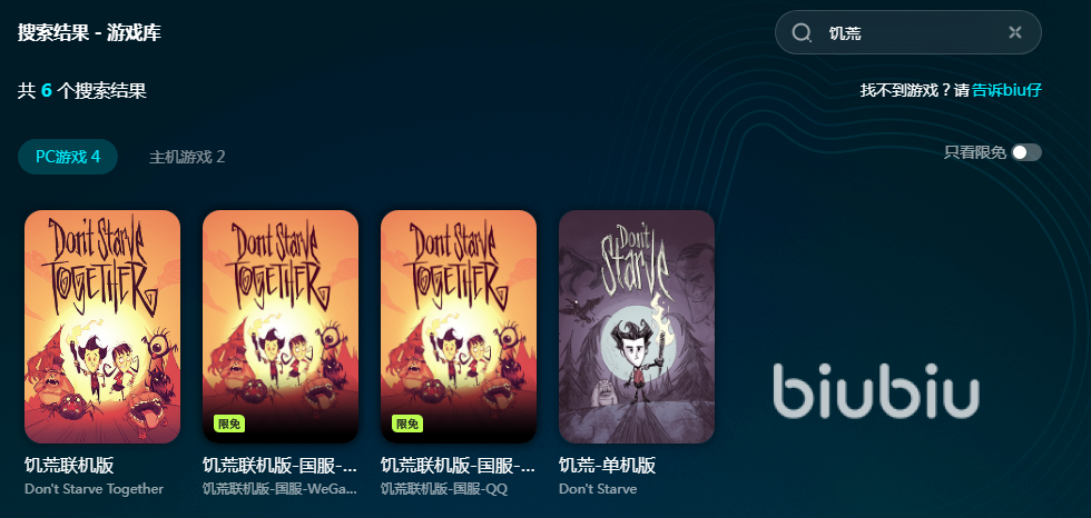 大家不妨来下载biubiu试用一下,安装好以后注册新用户就能获得24小时免费的试用时长,只要点击上方按钮就可以看到它的下载链接了。biubiu支持加速超多游戏,范围涉及国内外,不仅游戏齐全,涵盖的服务器还很广,在biubiu里可以搜到到饥荒多款游戏,想玩哪一个都能直接加速。