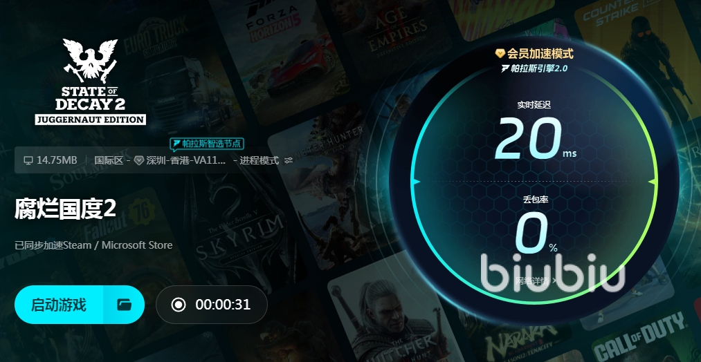 biubiu已经收录了腐烂国度2的加速资源,大家直接在软件里就能加速游戏,启动以后可以了解到网速具体有多少,随时监控的流量清晰明了,就连加速时长都显示给大家,方便用户安排游戏时间劳逸结合。游戏结束以后大家再点击一下时间,就会跳出结束选择,无论是开启还是关闭都很方便。