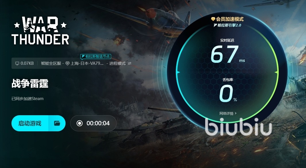在战争雷霆的游戏中,玩家们是可以享受到非常真实的战争题材游戏模式,我们将操控不同的武器去完成战斗,包括飞机的控制以及坦克的控制等等,针对敌人进行瞄准,也要利用地形的优势完成战斗。同时玩家如果面对强大的对手时也需要时刻保持警惕,合理的利用装备和技能也能提高我们的胜率,游戏会有丰富的场景设计,玩家都是可以自由选择的。而在体验这款游戏的过程中,不少玩家出现闪退的情况,这都是因为网络不稳定所导致的,想要解决大家不妨点击上面链接下载biubiu加速器,在biubiu的帮助下,我们都能够顺利的体验游戏。