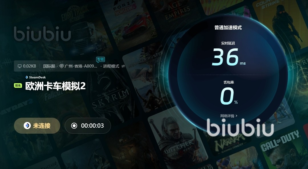 好了,以上便是欧卡模拟2闪退的全部介绍了,在大家体验这款模拟类游戏时,如果出现了网络方面的不稳定,或者丢包、掉帧等情况,那么还是非常难受的,而使用biubiu就能为大家很好的去解决这一现象,助力游戏获得更加丝滑且稳定的体验。