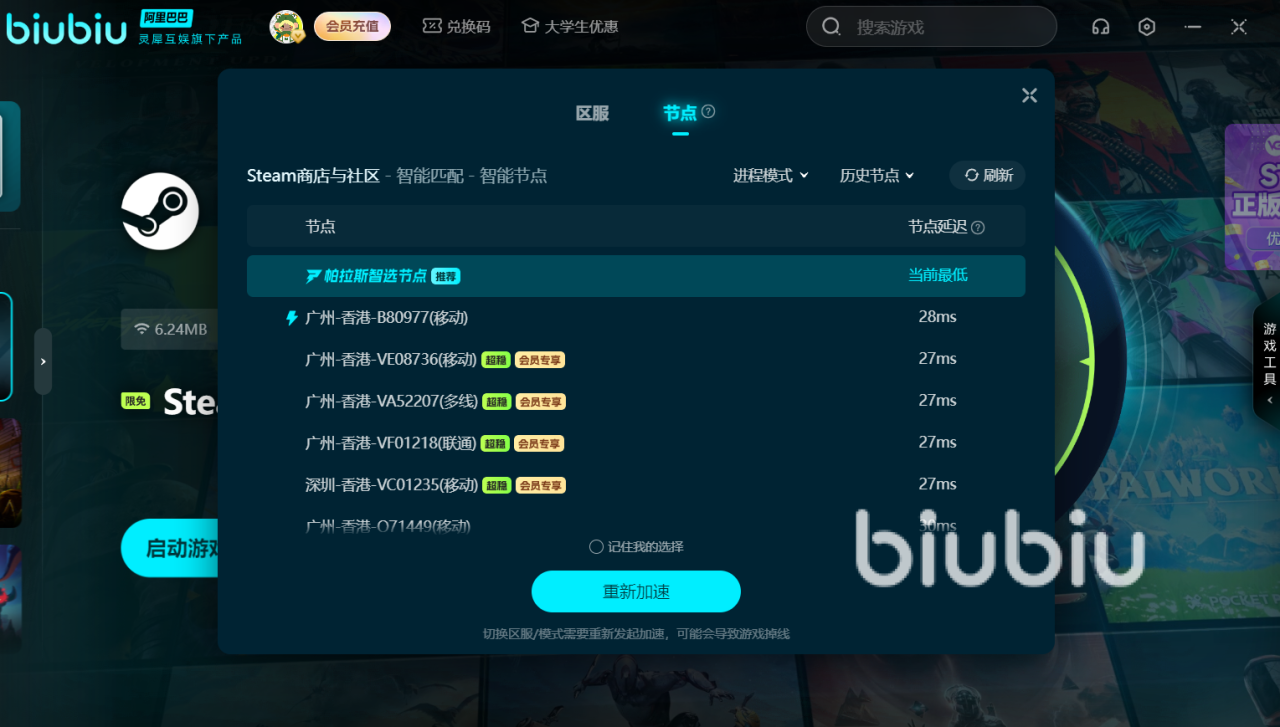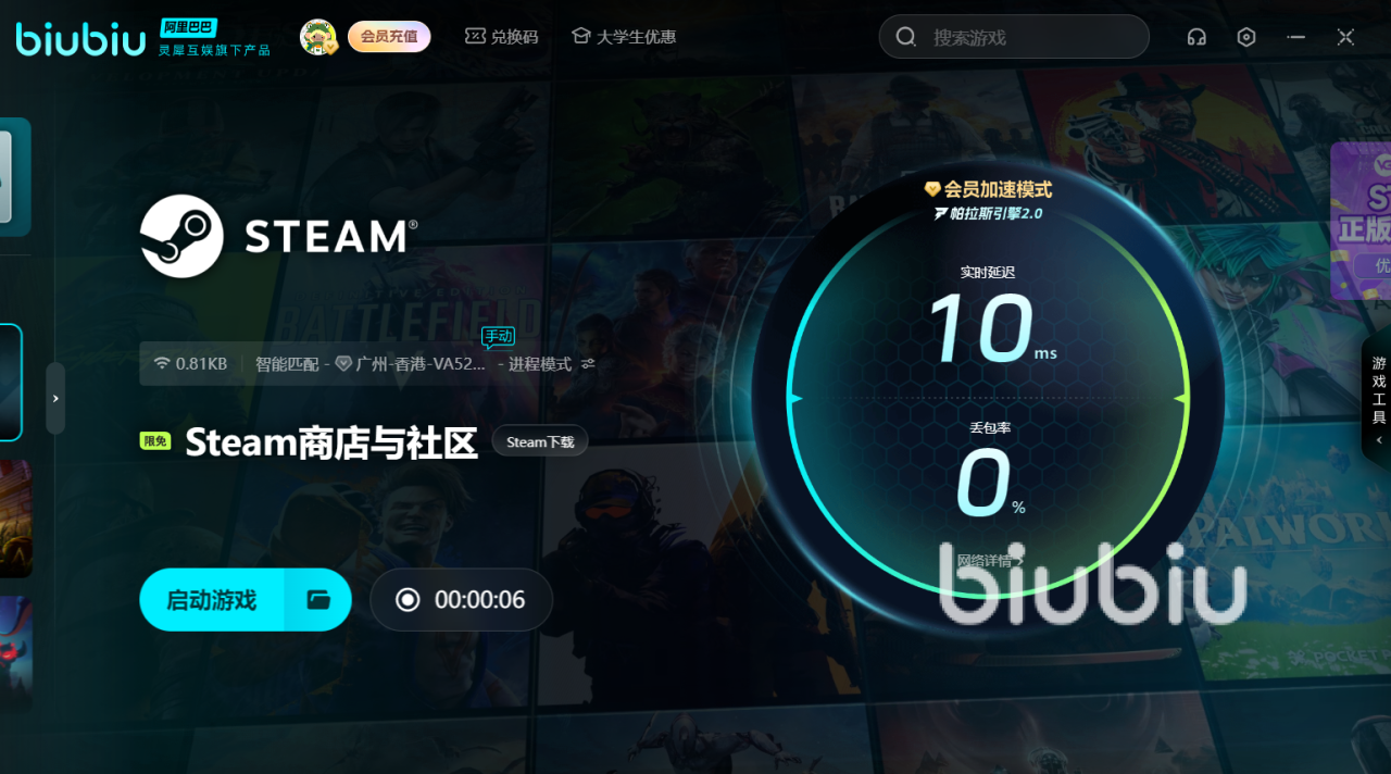 在biubiu软件的首页上方搜索你想要玩的游戏,可以搜出该游戏的多个登录平台,比如pc端与主机端都有。比如想加速steam,点击后选择想加速的区服,就能实现一键加速启动。游戏库包含海内外各大热门或小众的游戏,即使没有找到想加速的游戏,也可以联系biu仔客服帮找,或者申请本地游戏加速。