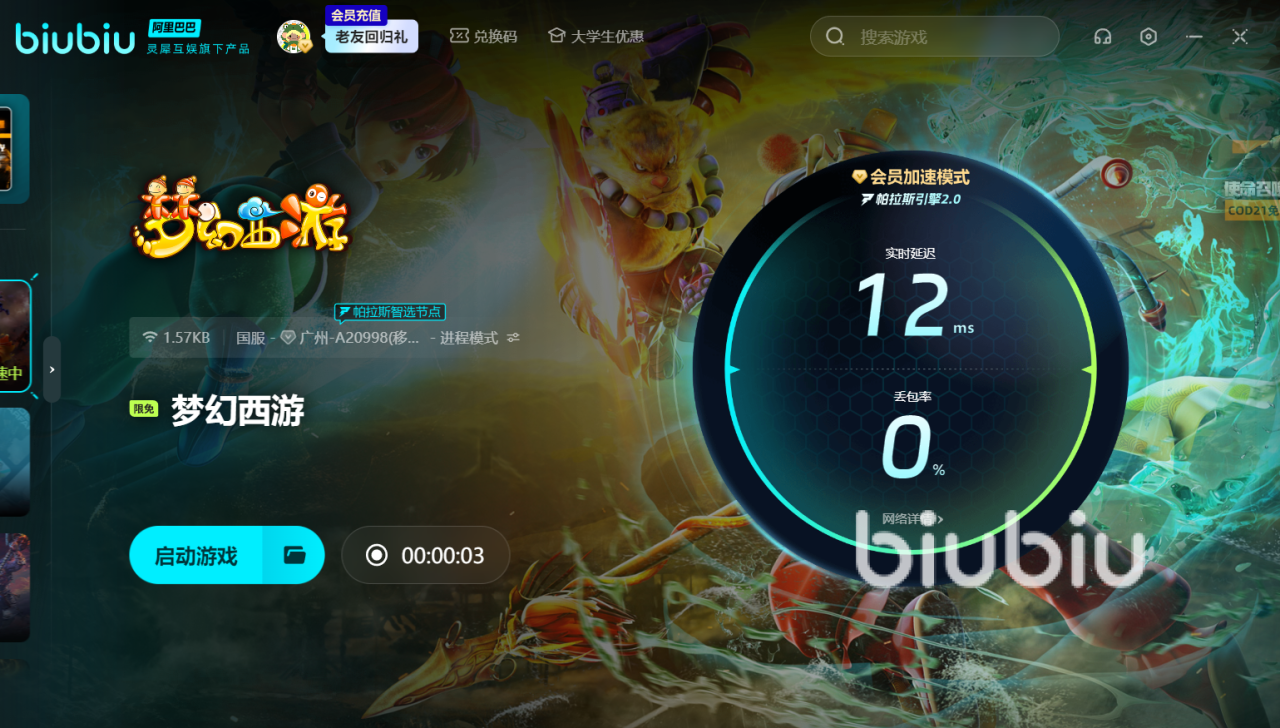 之所以向各位玩家推荐biubiu,因为现在有一个新人福利活动。如果你是biubiu新用户,点击下载注册后,可体验到免费加速24h的会员时长,亲自体验biubiu对梦幻西游的优秀加速效果,觉得不错,再选择充值也不迟。此外,为回馈各大新老用户,首页兑换输入【biubiu不卡顿】的小写兑换口令,还有额外的3天免费加速时长福利,大家记得兑换码是小写的哦。