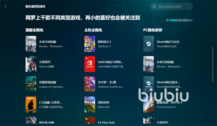 各位去选择biubiu,到时就能选择喜欢的游戏去进行一键加速优化,其涵盖了市面上各类热门的主机以及PC游戏,只需一键点击就能立即开启加速,软件也会为大家去自动搭载通道,不需要去进行复杂的设置,更是能实现多端口的同步加速哦。