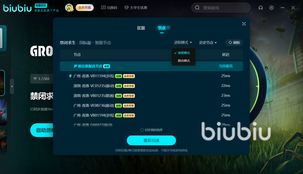 而且使用方式也非常简单,只需登录biubiu,然后再上方搜索栏键入“禁闭求生”,以及选好想加速的区服,点击进入页面即可一键加速。系统会根据玩家所在的宽带环境,自动检测适合的低延迟线路,玩家也可以根据自身需求换其他地区的线路节点,强大的加速效果当场看得见。
