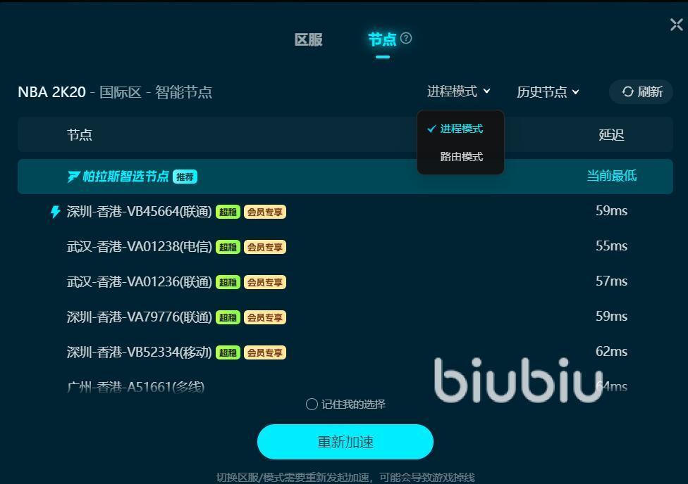 为了更用户带来更为舒适的加速服务,平台会同时为你提供多个不同的节点,你可以根据自己所处的区域去进行挑选,还能让系统替你去进行设置,在日常的使用中,要是发现了一个好用的节点,那么可以直接将其设为默认,之后就可以跳过这一步了。此外,平台内提供了进程和路由两种模式,你可以结合自己的实际状况去选择合适的模式,经过一番调整后,你就能享受到丝滑的游戏体验了。