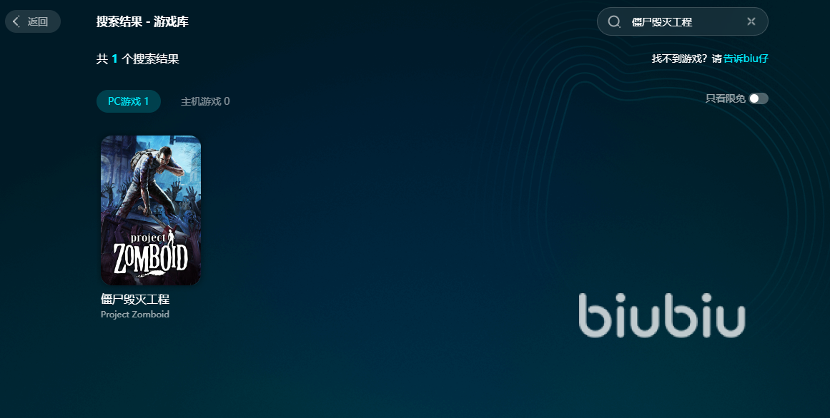 正好现在游戏就是能玩的状态,我们大可以开启游戏测试下使用效果是什么样的。在登录biubiu的客户端之后,可以利用搜索栏输入游戏名称,查找到对应的加速服务页面。biubiu的服务是很全面的,有PC端以及主机端两种,由于现在这款游戏只有PC端,所以我们只有一个选项。