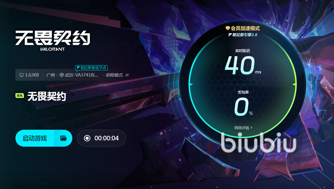 无畏契约是一款快节奏射击战斗游戏,它战斗机制惊现刺激,对于玩家们操作要求高,局势瞬息万变,场景还原度高,角色造型惊艳。这款游戏对于各方面要求较高,为了画面流畅,玩家必定要安装加速器。biubiu是行业内知名度较高的加速器,它使用效果,支持加速的游戏多,获得了超多玩家的认可。