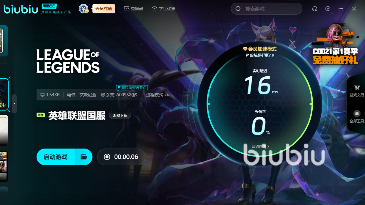 每次玩lol延迟高怎么解决?这时最好先用好biubiu,在他的协助下。不仅能够解决延迟问题,又能防止在团战时画面出现撕裂或者卡住,这样玩起来就仿佛吃了一颗定心丸。能够将自己所有的精神和注意力都放在对线或者团战中,而不是玩的束手束脚,让你进阶游戏大神!