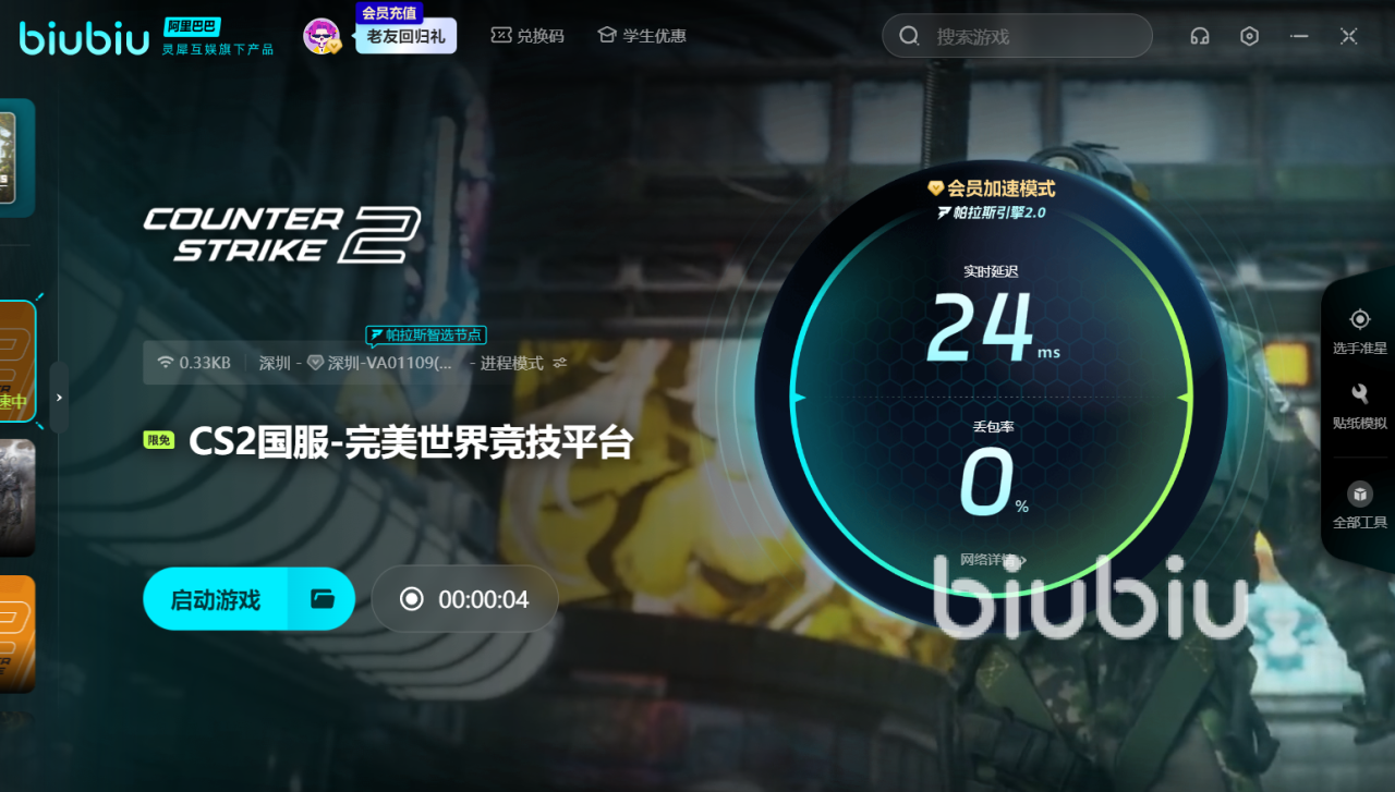 在Biubiu首页搜索“CSGO”,然后选择所在区服,即可进入页面一键加速并启动,期间软件会自动退至后台不会占用过多宝贵的电脑内存。完全可以实时看到CSGO优化之后的延迟大幅度下降,丢包率稳定在0%左右,本地波动都比较少见。