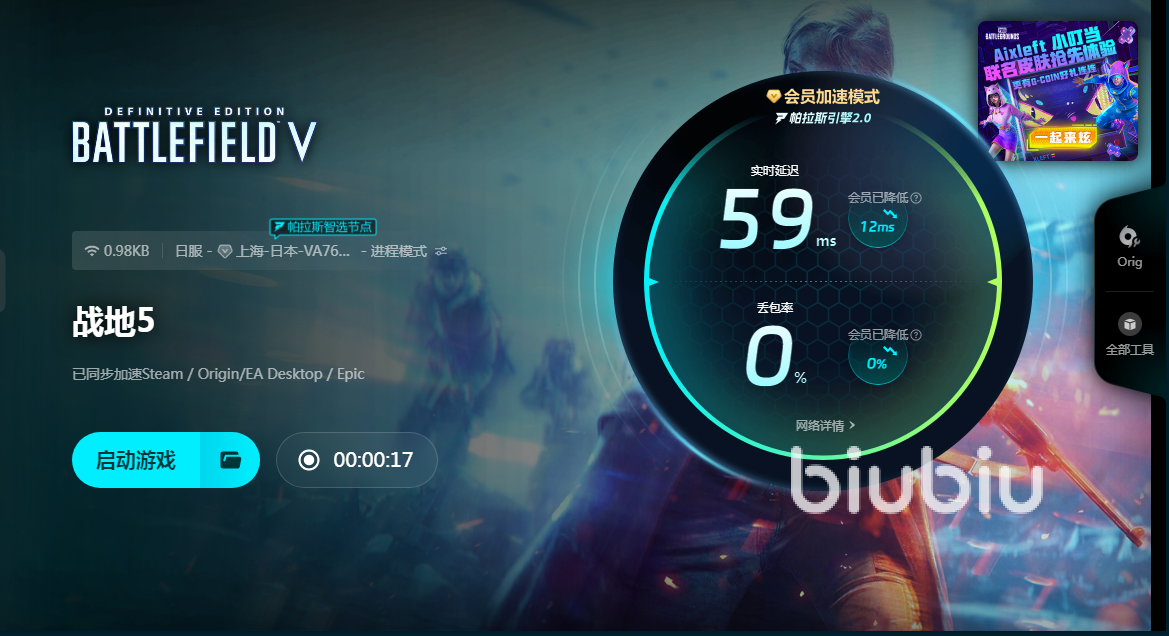 在战地5中,为了场景震撼力更为突出,采用了非常出色的画面表现能力,制造出了高度逼真的场景,细节方面处理得非常细腻,还有极为出色的光影效果。这些技术的加入,使得战场上的环境武器外观。以及射击特效等都非常逼真游戏的内容也很丰富,除了单人剧情之外,还加入了多种不同的模式,例如超大规模的多人作战等,这些都可以让玩家与其他人一起相互竞争,感受精彩的对战体验。由于是多人类型的游戏,所以会在网络上受到相应的影响,一旦网络出现问题,或者是服务器方面出现问题,就有可能导致延迟高,甚至直接卡顿。例如在界面上直接卡住等,这些都很影响体验。具体方法,需要使用加速器来进行操作,biubiu加速器就是一款很好用的软件,现在注册一个新账号,立即就能获得24小时加速时间,新人很合适加入进来。