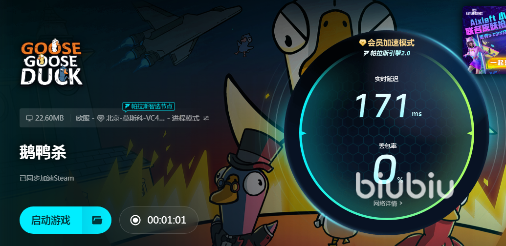 选加速器当然要找正规的,biubiu深受广大玩家的信赖,不仅普通玩家在用,很多大神玩家也喜欢用。它加速专业、价格实惠,新用户拥有免费体验24小时的福利,大学生用户还可以享受专属充值优惠。安装好软件以后大家搜索鹅鸭杀,然后就能开启一键加速了。