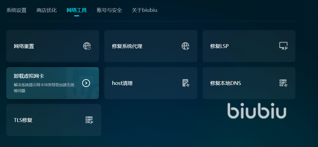 小编再教小伙伴们一个避免闪退的小技巧,可以用biubiu工具箱重置网卡,很多玩家更换游戏频繁,每玩一个新的游戏就要下新的虚拟网卡,退游以后也不记得把它们卸载了,导致电脑里有很多累赘网卡。通过工具箱来修复和重置电脑环境,游戏运行起来畅通无阻。