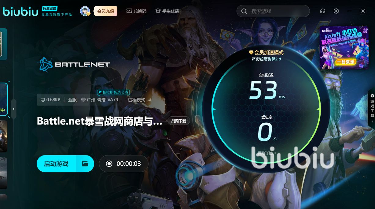 如果在战网玩炉石传说时延迟过高,就很难及时打出手里的王牌。用了biubiu后,方可没有阻碍地出牌,防止失去自己的那个回合。战网上的大作很多,若是都想更新好的话,就会耗费不少时间。使用加速器之后,才能让你缩短这个进程,更快体验上所有战网游戏!不过平台中途闪退的话,游戏网络也会跟着掉。所以只有依靠加速器,才能让你安稳地结束一场对局,避免受到严重的惩罚,甚至封号的可能性都很大。