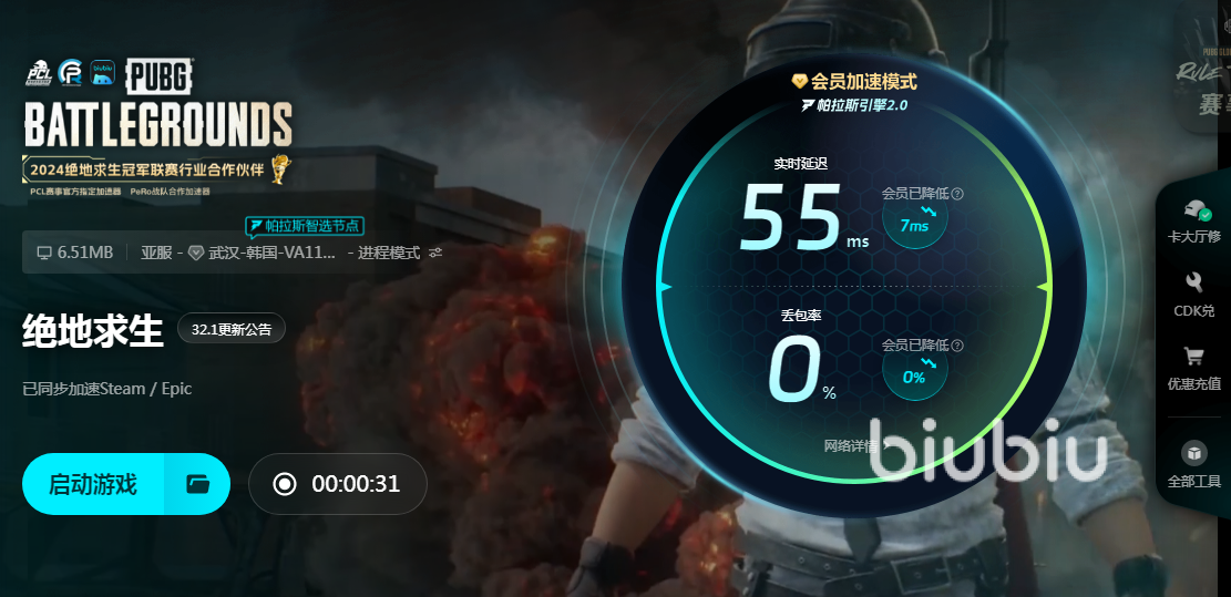 相信小伙伴们都知道绝地求生闪退怎么办了吧,只要有biubiu在,你们就能享受到非一般的网速,在毫秒之内的延迟几乎感受不到,游戏过程中的地图切换十分丝滑,跑动和操作起来也很流畅,队内沟通再也没有卡顿阻碍,一起来享受欢乐的游戏时光吧。