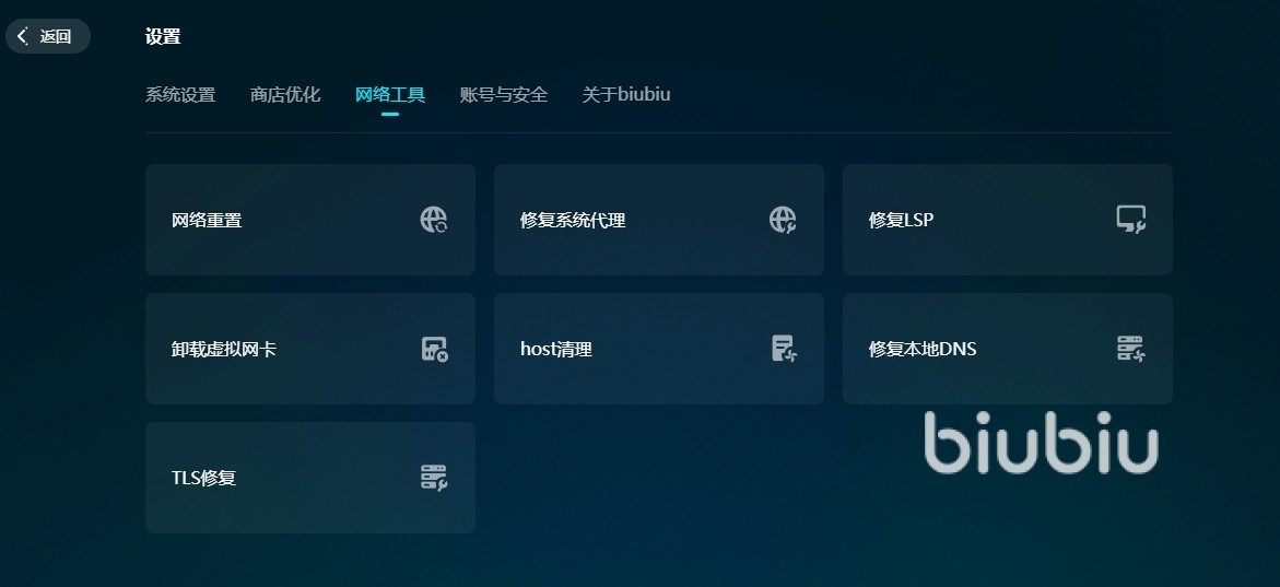 有时候网络出问题,那是因为设置有误,网早就断开了,这时候我们光开启加速服务是没反应的,网络必须重连。在biubiu这里也可以找到帮助的,在首页可以看到有个设置图标,点进去在游戏工具里面就能看到各种修复工具了,用上重置网络功能,就可以帮助我们解决问题了。