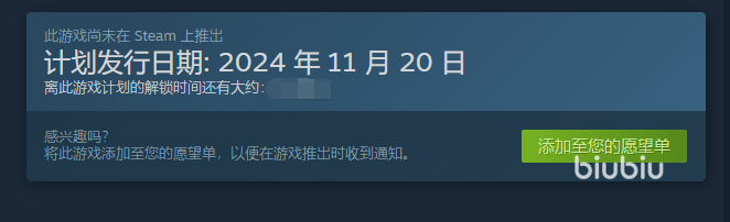 在游戏的专题页面中,玩家可以了解到游戏的详细介绍、发行日期、价格以及玩家评价等信息,据官方消息,这款游戏将于2024年11月20日正式上线,目前虽然还未上线,但已经可以提前将其添加到愿望单中了,以便在游戏上线时第一时间收到通知。