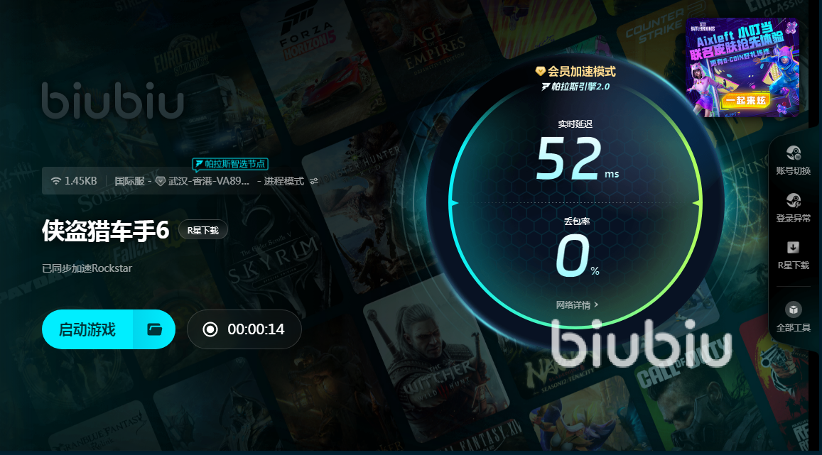 GTA系列有着很多共同特点,最吸引玩家的地方莫过于里面具有庞大且制作精细的地图和模型,为玩家贡献了一个巨大虚拟城市或者是地区。各种建筑风格、城市景观,都制作非常逼真,可以让大家自由去探索。还有着海量交通工具提供,摩托车,汽车,飞机,快艇等,都是在游戏里可以直接驾驶的载具,驾驶它们在游戏世界中自由驰骋,感受精良制作所带来的魅力。现在这些游戏,都需要连接服务器之后才可以体验玩法,所以对玩家来说,就面临着网络而引起的卡顿问题。Biubiu加速器就可以帮助很好地解决这一问题。小编强烈建议现在注册一个新账号,下载biubiu使用,因为新账号直接能获得24小时加速时间,这是不容错过的福利。