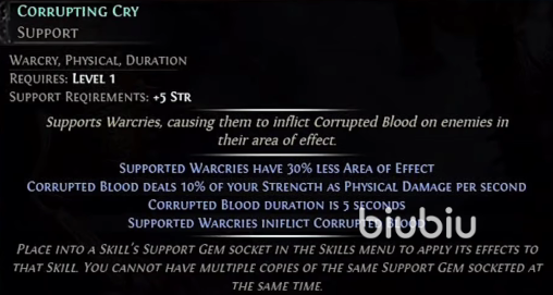 战争呐喊者是一个很有意思的路线,可以使用技能宝石腐蚀之血,可以对敌人施加一个5秒的流血效果,但是会消耗玩家的力量值,所以冷却代价还是有点高的。综合下来,在力量属性足够的时候用,打出来的总伤害量还是不错的。