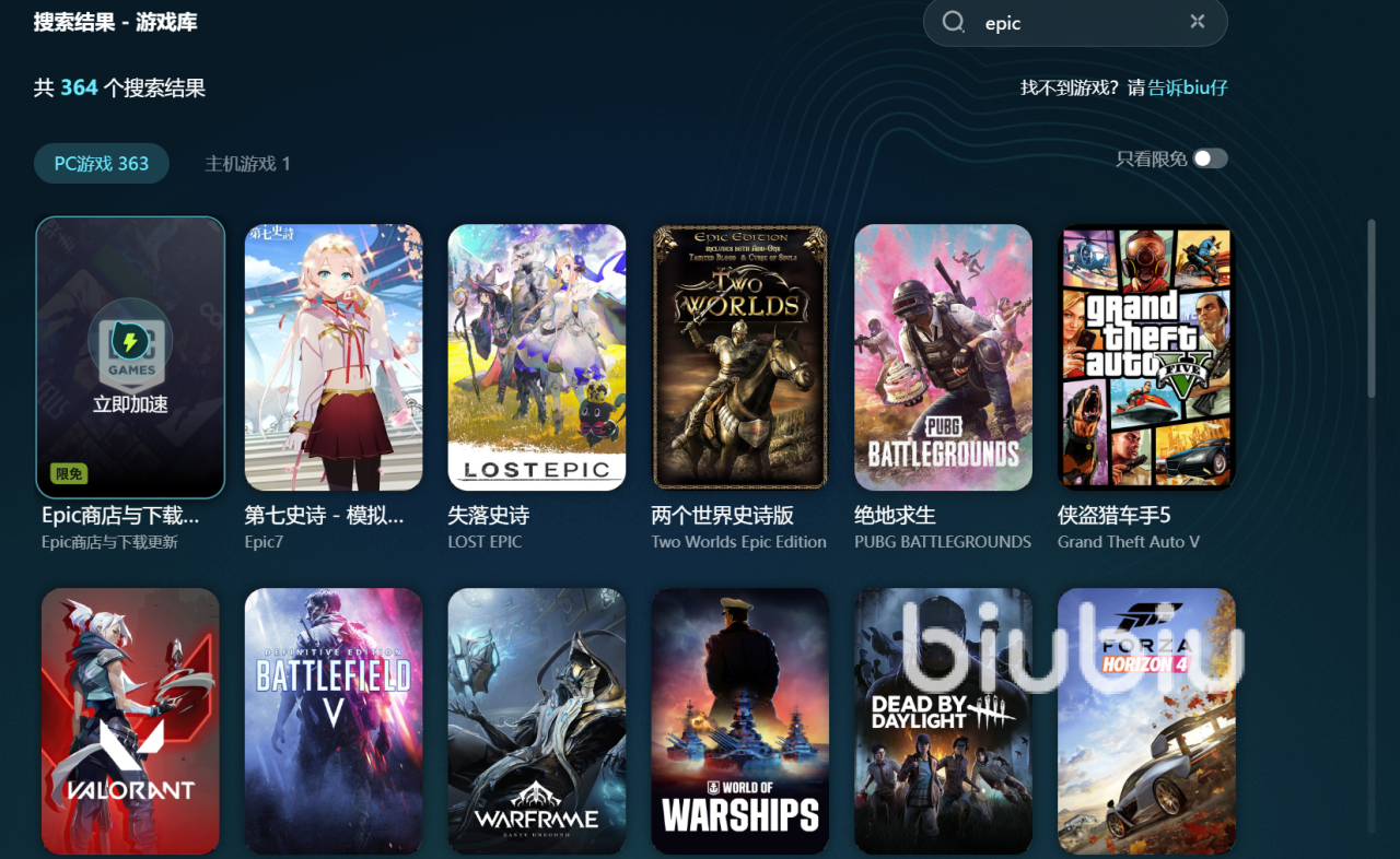 平台自创建以来就非常的受欢迎,其中很多的畅销作品,体验的过程当中会让玩家感受到十足的趣味,但是每个游戏的服务器搭建是不一样的,近距离的就是港服了,但是国内伙伴想要得到流畅的体验,加速工具是十分有必要的,其实如果大家在操作的时候遇到了网络明显状况,不妨试一下biubiu的加速器,确保游戏稳定运行的同时,还不会出现延迟和掉帧情况发生,刚好EPIC在biubiu平台可以享受长期免费优化加速活动。