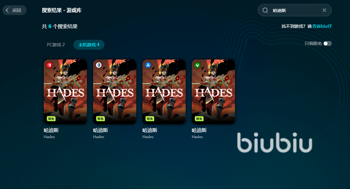 这款游戏因为题材的原因,我们体验完一次剧情,是不需要花那么久的。但是也不能浪费时长啊,还不赶紧用起来探索一些彩蛋以及隐藏关卡。现在biubiu是提供本作主机版本的服务的,主机游戏还享受限免服务,各位千万不要错过了,如果只看PC端的搜索结果,是看不到加速页面的,记得点到主机游戏这个分栏哦。