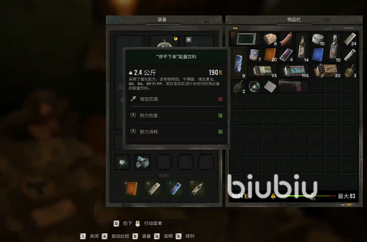 在饮品方面,可以根据上面的标志来选择适合自己的。带有闪电标志的饮品可以恢复体力,而带有辐射标志的饮品则可以降低你的辐射程度。因为辐射满值后你也会死亡,所以请务必注意自己的辐射水平。