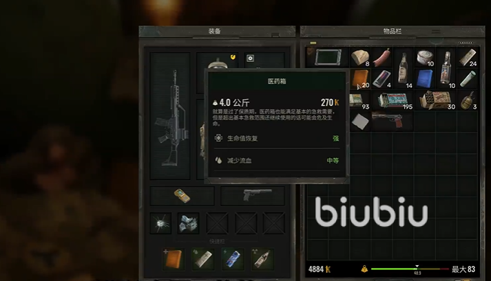 在药品方面,游戏中有药包和绷带两种恢复道具。药包可以迅速恢复生命值,而绷带则可以停止流血并恢复小部分生命值。后期还有更高级的军用药品可供选择。这些药品在关键时刻可以救你一命,因此不要吝啬使用。