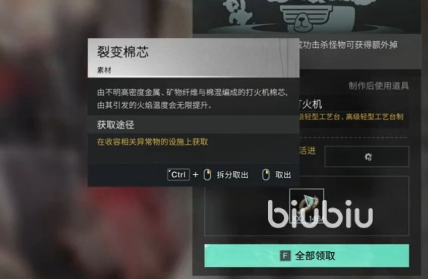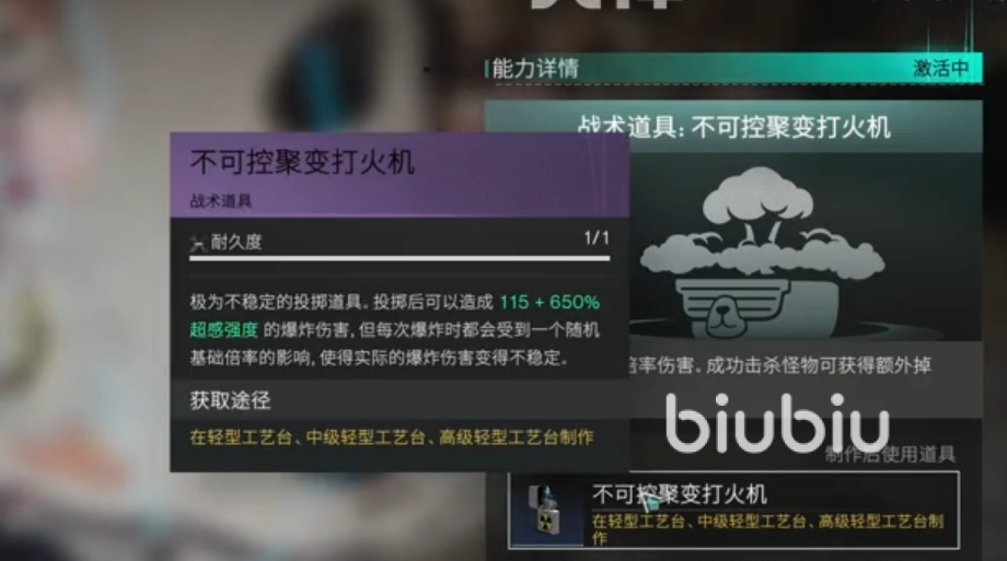 然后再工艺台里的话,可以直接合成不可控的聚变打火机,这是一个战术道具。当你使用的时候,可以触发我们摇篮里边使用战术道具之后的伤害加成。不过伤害不太稳定,毕竟每次使用时都会受到一个随机倍率的影响。