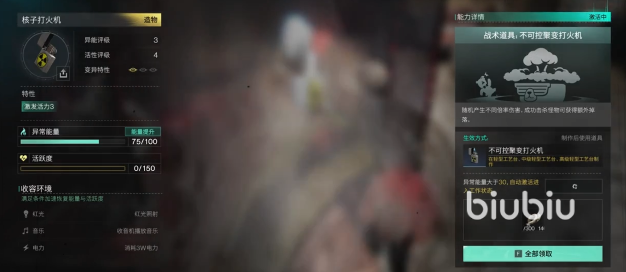 核子打火机是造物型的收容物,他会在工作状态下产生素材裂变棉芯,可以直接提升高达75点的异常能量,让你变得更强。另外满足条件时,例如处于红光照射,然后收音机播放音乐并且消耗3W电力时,就能更快恢复活跃度以及能量,令你频繁释放技能并打出优秀操作。