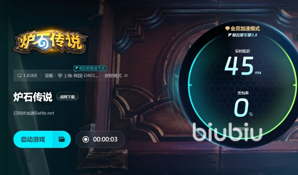 炉石传说这款游戏主打的就是策略类玩法,里面会拥有各种各样的卡牌,我们可以从激烈的交锋排位赛再到紧张刺激的自由乱斗,每一款模式都有自己独特的乐趣,除了传统对战之外,里面还会拥有更多全新的拓展包,我们将体验到更多的领域玩法。而且这款游戏也会具备预组套牌,即便是新手也能帮助大家更快的加入排位对决,了解不同套牌的模式,上手也会有更加容易,玩家可以完全按照自己的节奏随心所欲的体验游戏。不过在体验的过程中,卡顿就是大家经常遇到的困扰之一,尤其是在关键时候,一个简单的卡顿就有可能让我们的精心布局策略化为泡影。为了有效的改善卡顿等网络问题,biubiu就是一个很好的选择,它不但安全性出众,可以保障我们的隐私,还可以帮助大家稳固的连接服务器。