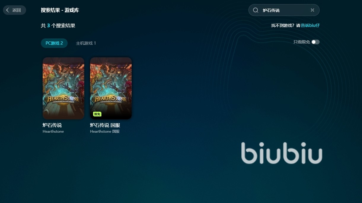 除了炉石传说之外,在biubiu内大家还能找到大量的PC游戏和主机游戏,目前部分游戏还处于限免状态,大家不需要额外开通会员就能直接享受加速福利,是不是非常惊喜呢?以上就是关于炉石传说卡顿怎么办的全部介绍了,想要在炉石传说的战场中更快的参与游戏竞技,那biubiu就一定要下载,它能成为我们最好的游戏伙伴,帮助大家顺利无阻的完成战斗。