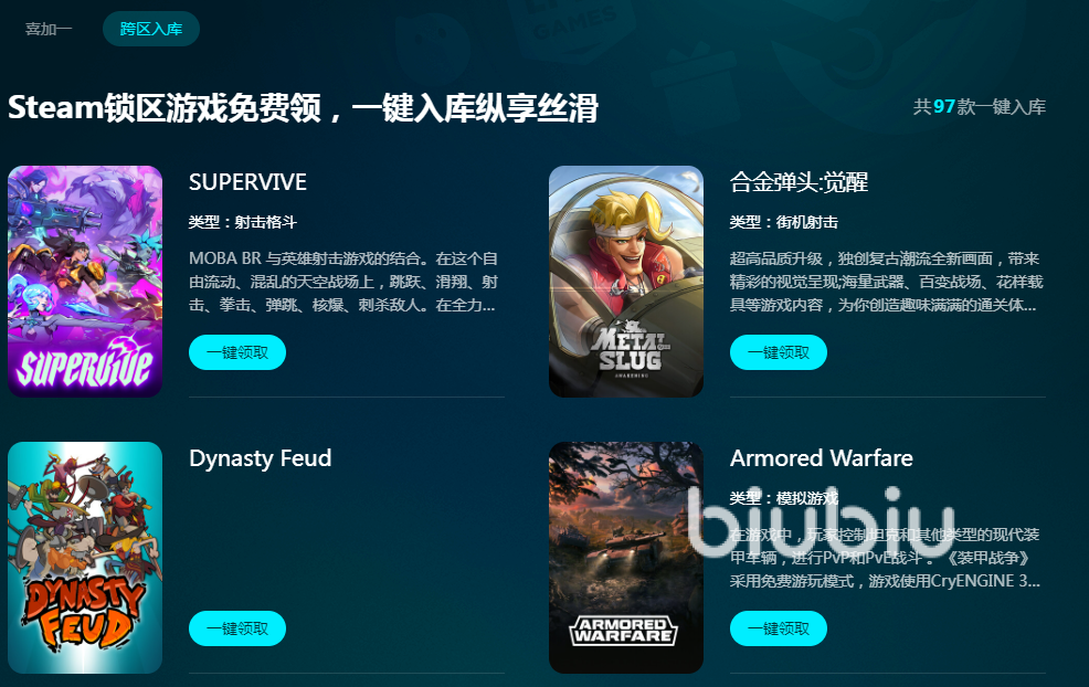 小编知道爱玩游戏的你不会只钟情于一款游戏,biubiu也准备了丰厚的福利带给大家。每期喜加一都会更新免费游戏,就算本期赠送的免费游戏不喜欢也没关系,关注biubiu等待下一期新的免费游戏即可。并且它还有steam跨区入库免费游戏,只要根据系统提示来操作就能领到手。