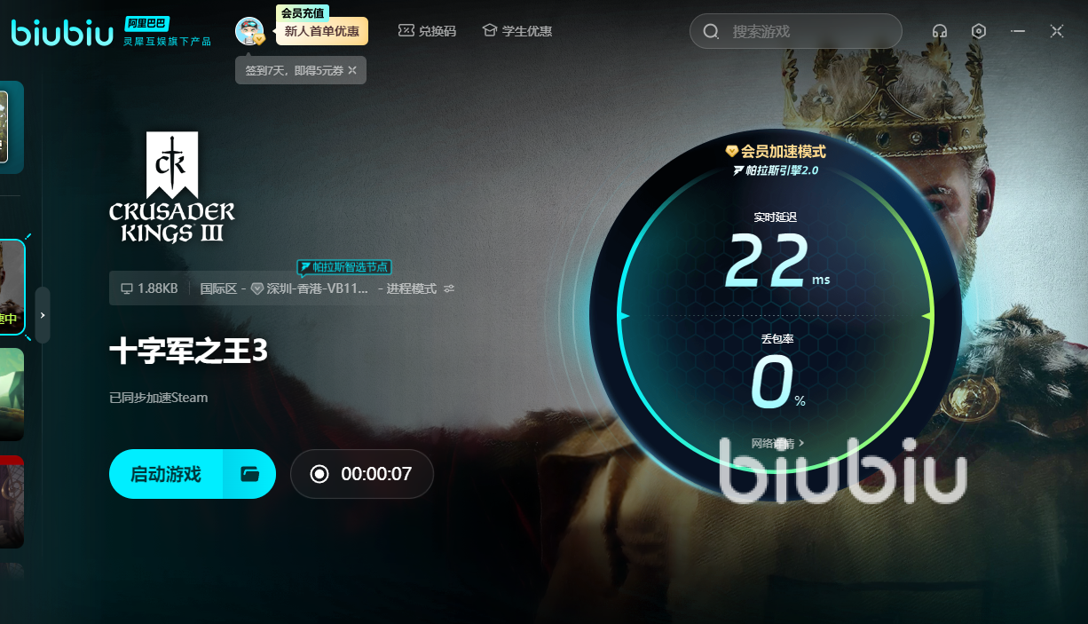 十字军之王3作为国际知名大作,尚未开始推出国服。所以打算进阶十字军中的统治者,就得用上biubiu。加速过后才能跨越几个世纪,让你来到新的家族或者国度中。新用户的话可以领取24小时的免费加速,另外新老用户输入【biubiu不卡顿】,就能额外获得三天免费加速。如果在发展途中太卡,就会限制你的扩张速度。使用加速器后,就能避免卡顿,能够无限制的扩张。要是与人开战时延迟过高,就无法及时做出周全的准备。有了加速器后,就能降低延迟,及时做好各种准备。
