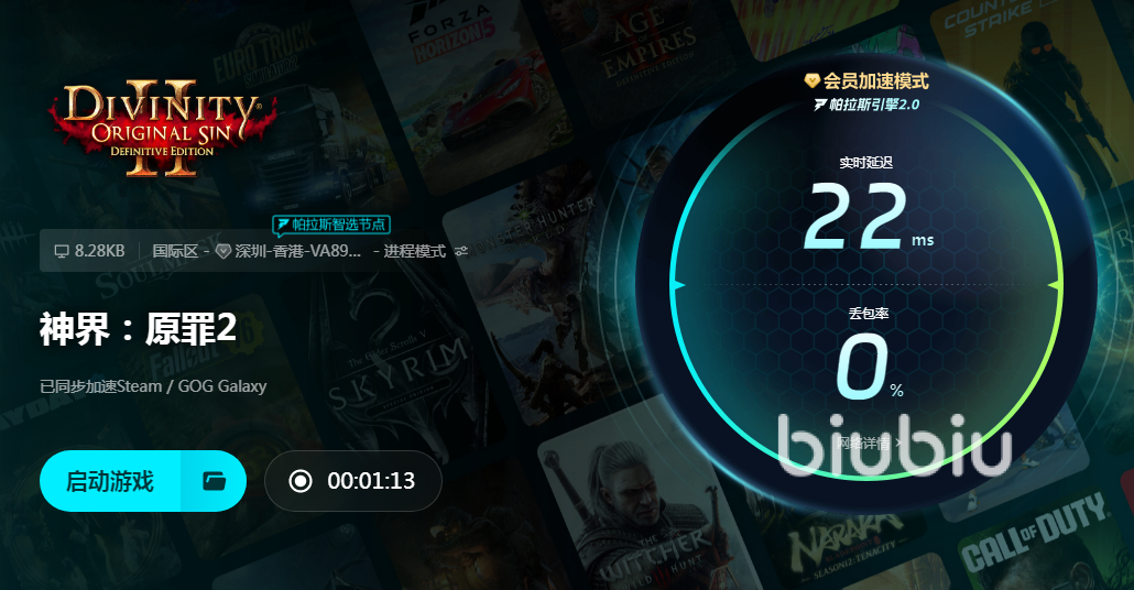 另外小编还有兑换码【biubiu不卡顿】赠送3天免费加速给大家,平台内可以直接找到神界原罪2游戏,它还会同步加速到steam和GOG Galasy上面,不管你是玩哪个平台都能享受网速同步。它不仅支持智能节点,还可以随时查看流量,当玩游戏的时候只要把软件最小化到任务栏,就不会影响电脑桌面的整洁,还能在后台一直加速。