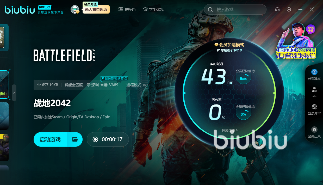 推荐大家下载上面给大家放好的链接,新用户注册直接获得24小时的免费加速时长,结束之后还可以输入【biubiu不卡顿】再次获得72小时,即使是之前已经注册过的老用户也是可以使用该兑换码的。另外一种情况就是该游戏启动之后可能会爆内存,一般来说目前16G的运行内存打开两个社交软件和浏览器的一堆东西再运行满画质的2042就已经有些吃力了,更别说进入对局之后还要与其他玩家的服务器进行连接,这就更需要加速器来帮助处理,另外玩家们也可以降低一下电脑画质。