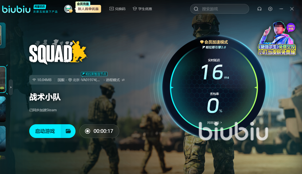 当然游戏的卡顿严重问题有直接关系的就是网络延迟,所以准备一款加速器相当重要。点击上方按钮下载,新用户注册即可获得24小时的免费加速,用完之后然后输入【biubiu不卡顿】即可再次体验三天的加速时长。因为每个玩家在进入对局的时候都是要选择一个服务器进入的,默认设定的最大延迟是不能高于300,所以搜不到服务器或者服务器比较少的话,可以开启加速器来进入一个稳定的对局环境,毕竟要和外国玩家进行作战,而且该游戏需要全程开麦沟通,不开加速器根本玩不了。