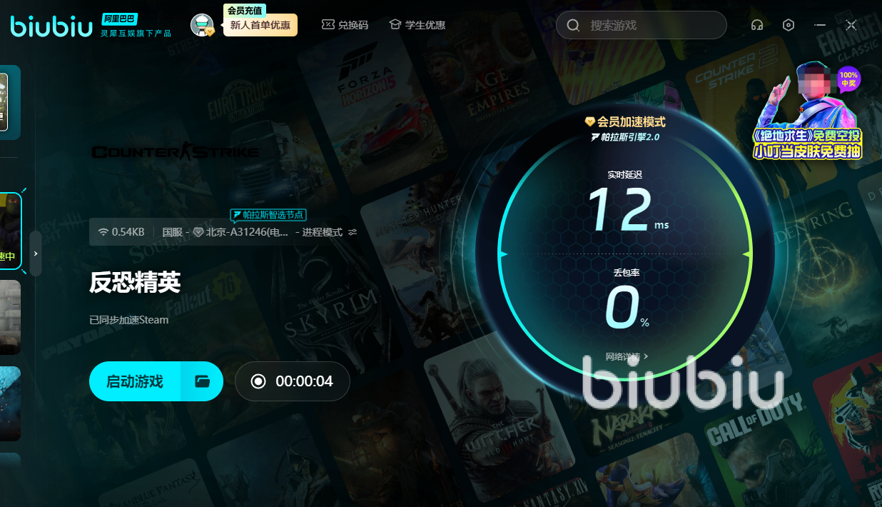 给大家推荐的biubiu目前新人点击上方按钮下载注册,就可以获得24小时的免费加速时长,新老用户输入【biubiu不卡顿】可以再次获得72小时。进入应用之后选择好自己所要玩的区服就会帮助大家自动选择最近而且延迟最低的节点,丢包率基本为0,再也不用担心对拼先开枪没的却是自己的情况发生了。