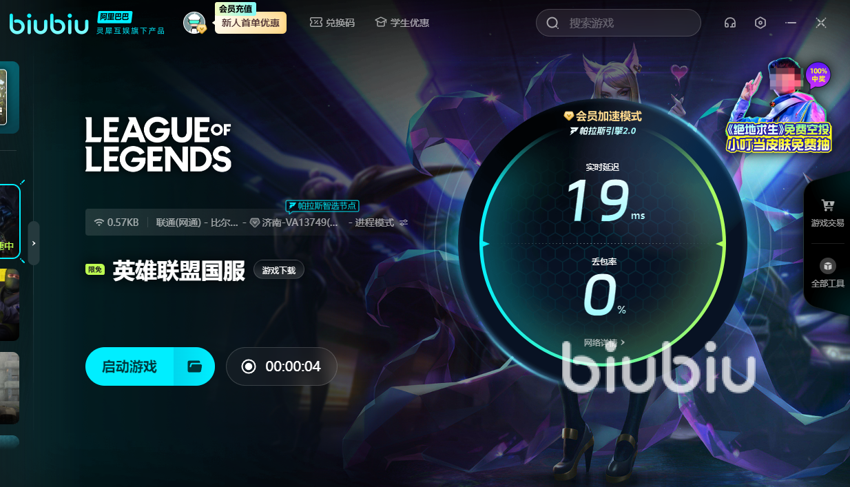 biubiu加速器目前针对国服是可以免费加速的,尤其是网通的玩家遇到的大乱斗卡顿问题比较多。目前新用户登录完成实名认证就可以获得24小时的免费加速时长,用完之后在应用首页上方兑换码处输入【biubiu不卡顿】可以再次获得72小时,加速之后再玩目前的大乱斗模式就可以很好的缓解卡顿掉帧;目前由于双城之战新剧情PV的发布,让这款地图的小兵和建筑模型已经好似不属于这款游戏,因为太精致了。开启加速器最直观的感受就是网络延迟控制在了50以内,也不会有任何的丢包率了。