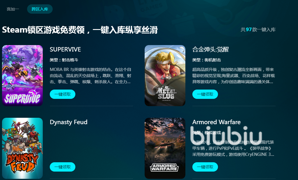 如果巫师3玩累了,就来看看biubiu跨区入库吧,里面有大量免费游戏,质量高口碑好。遇到喜欢的免费游戏赶紧参照系统提示的方法领取,尤其是一键入库特别方便,如果每个游戏都领取的话能省下来的买游戏钱可不少呢。