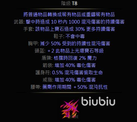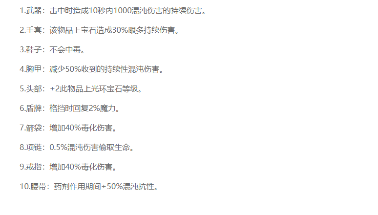 道具用在不同的部位,得到的效果是不一样的,比如说用在武器上面,是可以造成10秒以下的1000点持续的混沌伤害,另外在手套上,会造成30%以上的持续伤害,加成还是比较大的。