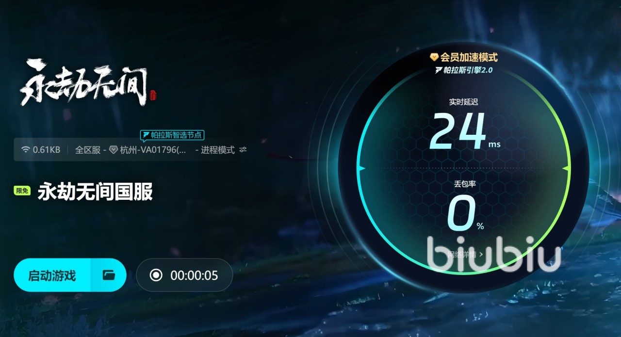 永劫无间的地图信息多且复杂,每时每刻要上传全地图所有人的操作信息,经服务器运算后,再将状态发放至各个对应的客户端……总之数据传输量巨大。假如网络节点很少、路径规划不合理回路多的话,就很容易造成高延迟甚至掉线,尤其在用网高峰时段。为此,小編試用了多款加速软件,終于挖到一款宝藏加速器——biubiu。