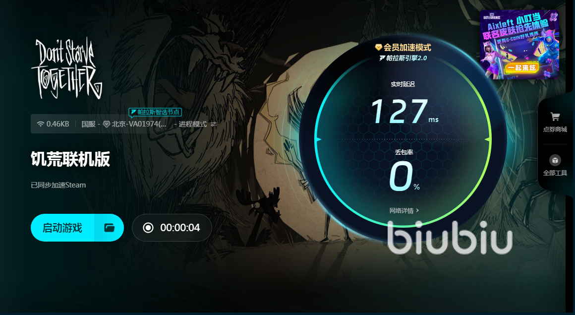 饥荒拥有自己独特的画风,采用的是哥特式元素打造卡通风格画面,这样的组合可以带来一种神秘且独特的氛围。在生存中能选择多个不一样的角色,不同的角色又不一样的生存体验,有着丰富的角色以及相应的技能系统,不同人物都有自己特点,这样多样化设计,也增加了趣味性和可玩性。游戏最复杂的,就在于自身生存系统方面,需要时刻关注多个不同属性,在不同季节,有不一样生存方式。在游戏里还能够自由进行探索与建造,收集资源来建造基地。玩家也能选择和好友一起组队,共同面对挑战,在多人联机时候,一旦出现卡顿是很影响体验,使用biubiu加速器运行,就可以很好地解决这个问题。Biubiu现在推出很多福利,回馈广大用户,首先是兑换码福利,打开兑换功能后,将【biubiu不卡顿】填写进去,就能够免费得到三天加速时间。