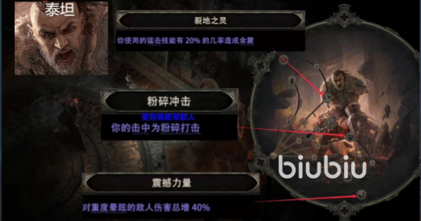 首先就是泰坦分支,核心技能是以下三个,裂地之灵,有猛击技能的时候是有20%的可能性造成余震的,然后粉碎冲击更容易眩晕敌人,伤害也高,接着就是震撼力量,衔接眩晕技能使用输出手段,在打中重度眩晕的敌人时,伤害量会增加40%的。