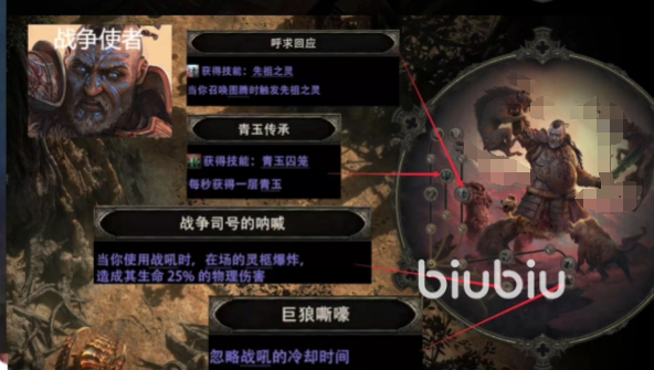 战争使者这个派系打击感更强一点的,也更像野蛮人一点,比较好上手,我们点高呼求回应之后,就可以得到先组之灵的力量,召唤图腾来进行战斗,然后战争司号就是战吼,可以形成爆炸伤害,对于近战来说打击感是很爽的,然后配上巨狼嘶嚎,还可以忽略战吼的冷却时间,频繁输出。