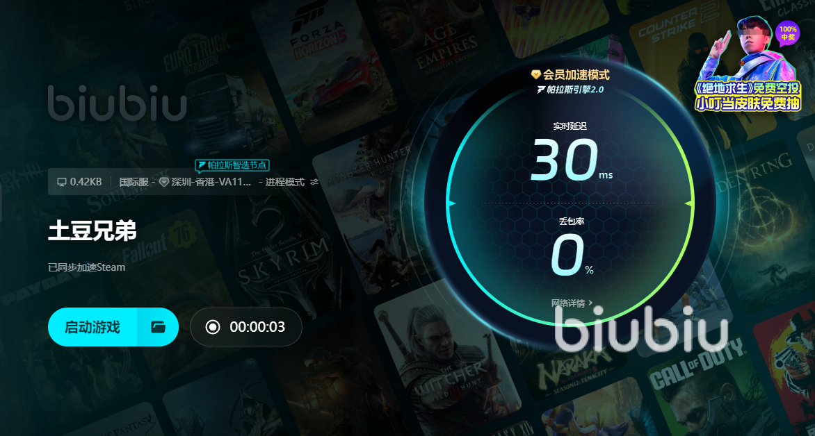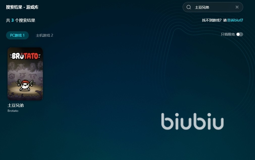 要知道,我们在使用biubiu的过程中也是很便利的,大家不用担心其操作会很复杂,只需在右上角的搜索框中输入“土豆兄弟”,就能顺利找到对应作品并点击加速,如此即可享受流畅的体验,该工具覆盖了主机、PC多个不同版本,旨在让我们能去自由进行挑选,而不用担心会有延迟等现象发生。