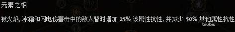 此玩法的核心就是使用燃烧戒指来配合我们天赋中的元素之相这个技能,凡是被火焰,冰霜以及闪电击中的敌人,暂时增加25%这些属性的抗性,然后减少其他抗性50%,所以这个玩法思路就奠定了基础。