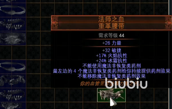 综上所述,药法血也就是法师之血这条重革腰带是非常有效的,它可以让我们从十二种功能药剂中挑八条词缀在人物身上携带。需要注意的是,当我们装备上这条腰带之后就不能使用魔法非恢复类药剂,所以在选择之前注意先将药品栏的顺序检查下是否需要卸下某些药剂哦。