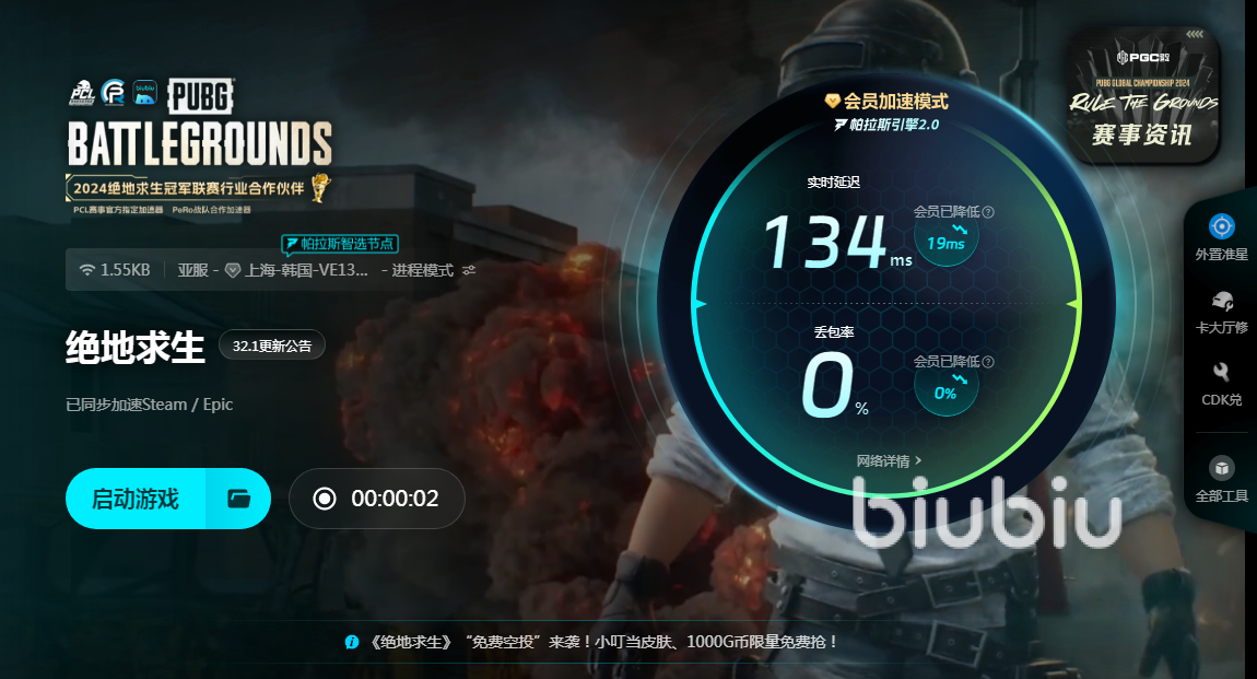 pubg最吸引大家的地方莫过于多人同地图竞技,在同一张地图中进行对战,可以自由选择不同枪械和武器装备,采用不一样的战术取得最后胜利。随着游戏地图越缩越小,众多玩家将会集中在一起开始激烈角逐。游戏从落地那一刻起,就伴随着激烈战斗,随时都有可能爆发冲突,所以良好网络自然是最重要方面。当大家去亚服体验的时候,很多玩家都遇到延迟高、卡顿等现象,这样非常影响成绩,所以一定要有靠谱加速器软件,既可以帮助快速方便连接,就能够降低延迟,biubiu加速器就非常适合。现在biubiu加速器福利非常适合新用户加入进来,因为新注册账号将直接获得24小时加速时间,有了这样的福利就不用担心性能方面问题,先尝试一下。