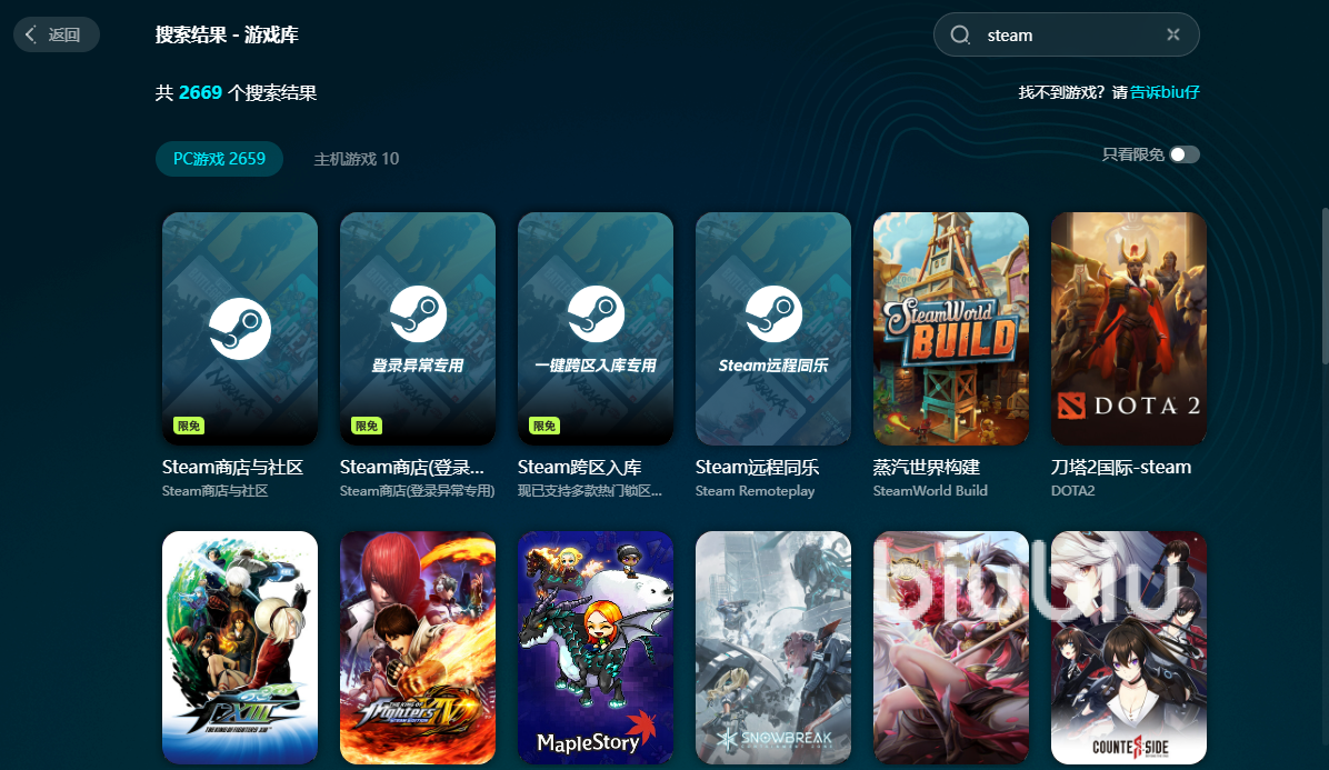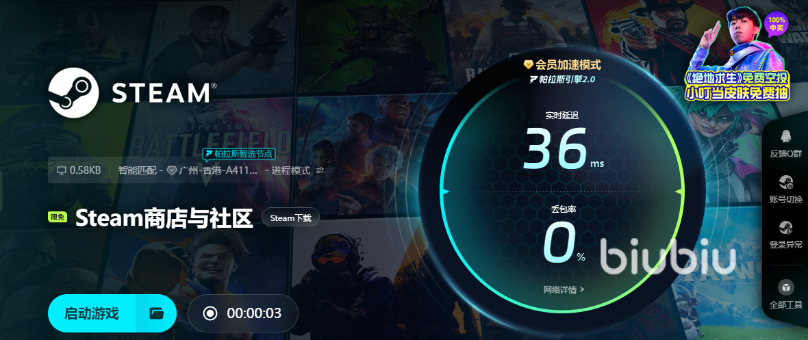 为了避免这种情况发生,小编在亲测后为玩家们找出了一款绝对可以解决玩家们在使用steam时出现问题的软件,那就是biubiu加速器。在下载完成后打开它的第一瞬间,各位小伙伴们就可以发现它的操作页面设置得非常简洁明了,基本上没有什么令人眼花缭乱的各式按键。想要使用它对steam进行加速的话,只需要在软件库中搜索然后点击开始加速按钮就可以完成操作了。它的优势在于,对steam的加速是完全免费的,大家可以轻松快速地打开之前使用过程中常常遇见问题的游戏商店,顺畅地对自己想要游玩的游戏进行搜索、查看和下载,绝对能给小伙伴们提供一个稳定的网络。