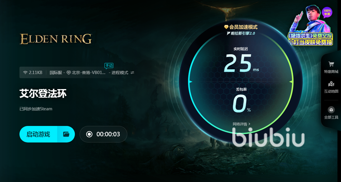艾尔登法环大多数内容都是单机玩法,也就是不会产生太多的互动和数据交换,所以单人体验是无需加速器进行优化的。但是在下载安装时候是有相应需求的,在下载游戏客户端时,需要对相应游戏平台进行加速,这样可以更好完成下载更新任务。除此之外,这款游戏还能进行联机,如果选择进行联机操作,那么加速器是很有必要的优化工具。因为只有在优化之后,才可以更好地连接服务器,提供稳定连接效果。无论想要进行哪种操作,最佳加速器选择依然是biubiu。这款加速器工具性能优异,价格优惠,更是有着免费试用福利提供给用户。现在福利可谓是走过路过绝对不容错过。新注册账号后立即能得到24小时加速时间,有了这样福利真的不用再担心加速效果问题。